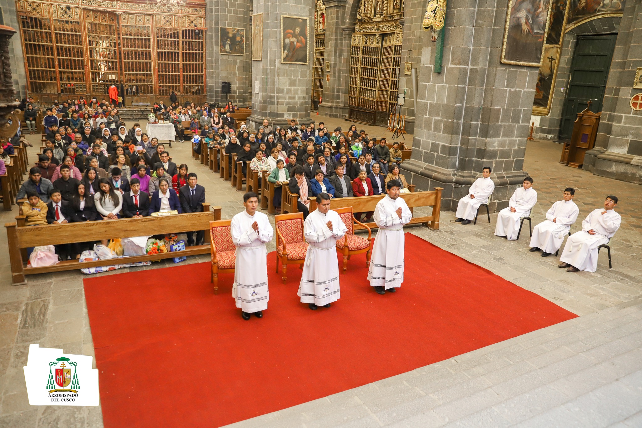#aprimerahora# cusco.- La Arquidiócesis del Cusco el último fin de semana en la Basílica Catedral, se celebró la ordenación Diaconal de los Hermanos: Wilbert Ojeda Vargas, Roger Huamán Suclli y Maxsuel Huamán Quispe, por imposición de manos de Mons. Richard Daniel Alarcón Urrutia, Arzobispo Metropolitano del Cusco.