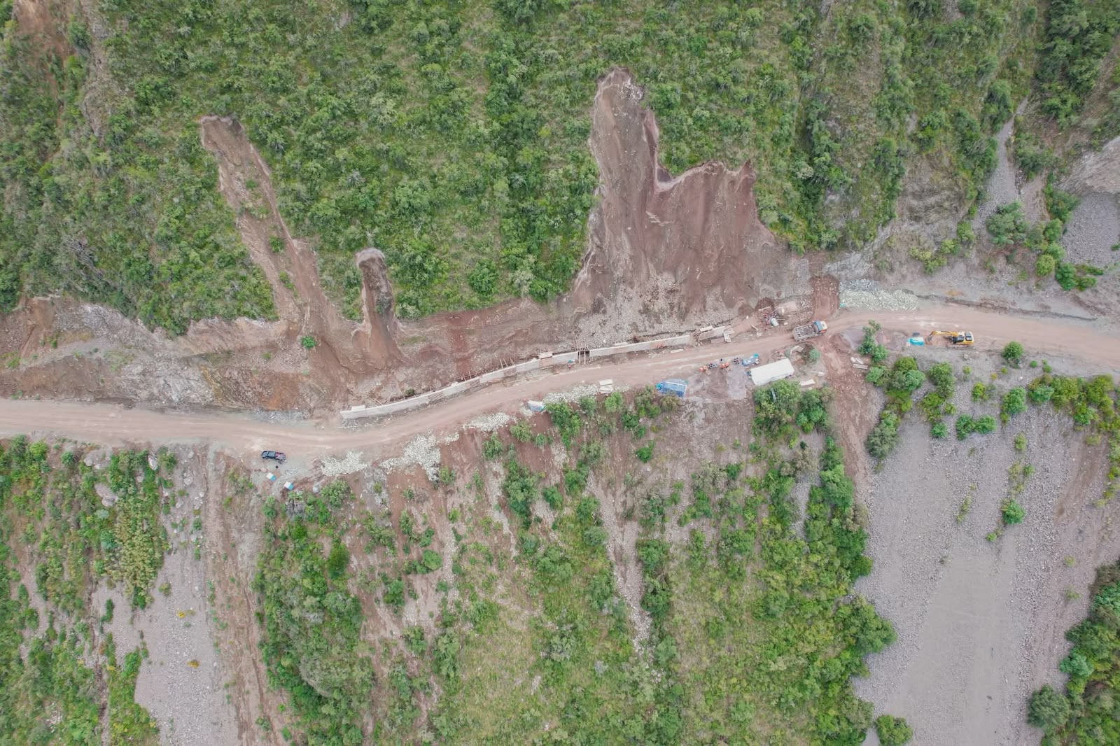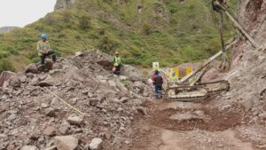 Actualmente, se desarrollan trabajos de perforación y voladura de roca, así como la construcción de alcantarillas, badenes y muros de contención, acciones que permitirán garantizar una vía segura y eficiente.