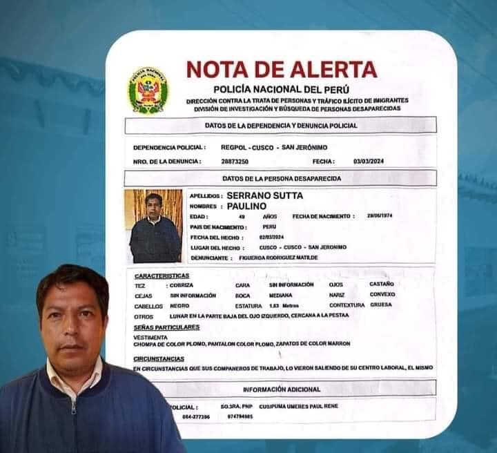 “En esa entrega cumpliendo los protocolos administrativos de esta agencia le hacen firmar una boleta y la huella dactilar, cuyo documento lo hemos obtenido y efectivamente al hacer la verificación, se llegó a establecer que se trata del ciudadano Paulino Serrano Sutta, esto ya no es una desaparición el sujeto habría abandonado su hogar, para emprender nuevos rumbos”,