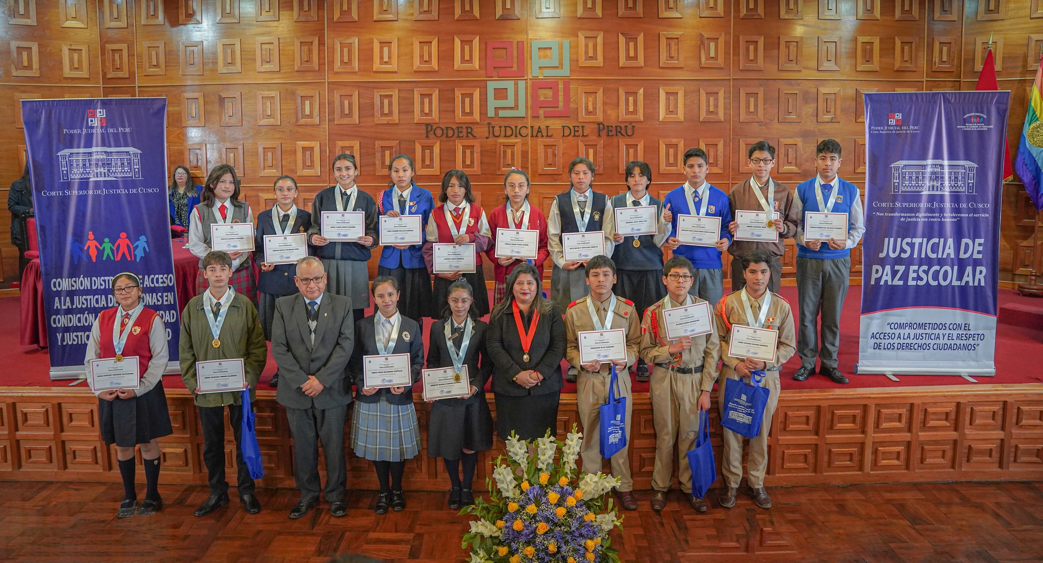 #aprimerahora# cusco.- La presidenta de la Corte Superior de Justicia del Cusco, Dra. Karinna Holgado Noa, ayer juramento en ceremonia publica a los jueces de paz y secretarios escolares de 16 Instituciones Educativas de la ciudad, este acto se realizo en el local del Palacio de Justicia.