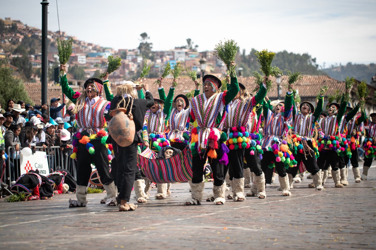 #aprimerahora# cusco.- Los estudiantes de institutos superiores desarrollaron un espectacular desfile de danzas de la región en homenaje al mes jubilar de la ciudad la ciudad, con la muestra de sus mejores danzas para el deleite del público asistente en la Plaza Mayor.