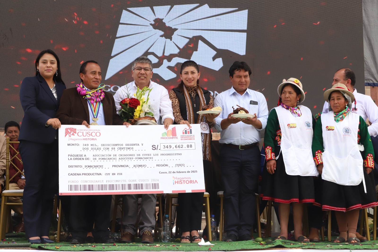 #cusco# aprimerahora.- El Gobierno Regional el sábado ultimo en la Plaza San Francisco en una ceremonia publica premio a los 102 pro compites que ganaron el concurso el año 2024 y se entregaron los cheques por un valor de 25 millones de soles, premio a la competitividad