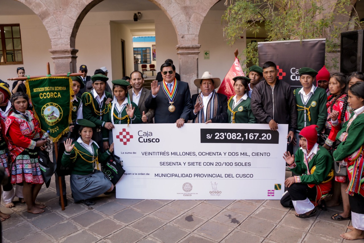 En esta oportunidad los ejecutivos de la entidad crediticia entregaron el cheque al burgomaestre quien en presencia de los estudiantes de la Institución Educativa Intercultural Qhapaq Ñan del distrito de Ccorca al ver la imponente y moderna infraestructura en la que estudiarán los próximos años, es la mejor retribución en favor de la educación.
