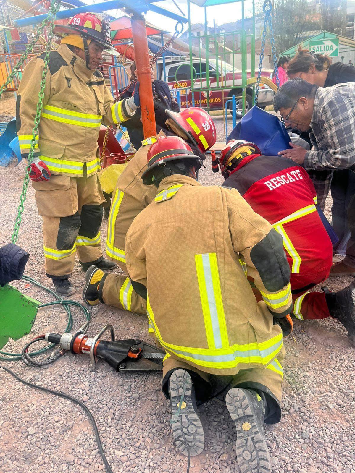 #cusco#aprimerahora.com.- En el parque infantil Urpicha de la Alameda Pachacutec de esta ciudad ayer se registo una emergencia, donde un niño de 8 años que había acudido a este complejo quedo atrapado en una estructura metálica, lo que provoco que se alerte y se presenten las brigadas de rescate como son los bomberos.