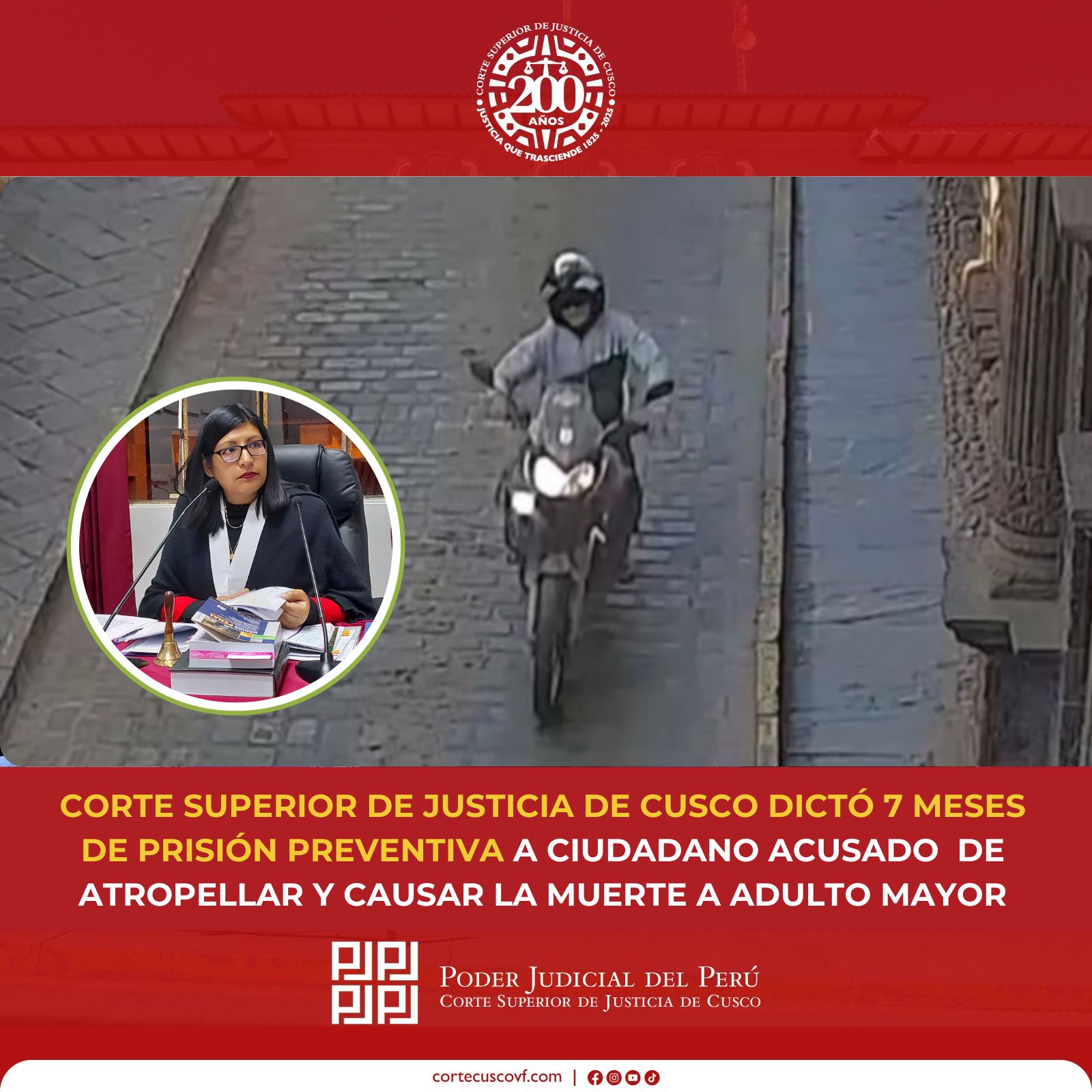 a Jueza del Segundo Juzgado de Investigación Preparatoria de Cusco, Dra. Katia Álvarez Cruz, dictó 7 meses de prisión preventiva contra el ciudadano de iniciales Angel.Berrio Carmona, por los presuntos delitos de homicidio culposo, omisión de socorro, exposición al peligro y fuga del lugar del accidente de tránsito, previsto y sancionado en los artículos 111, 126 y 408 del Código Penal, en agravio de un adulto mayor.