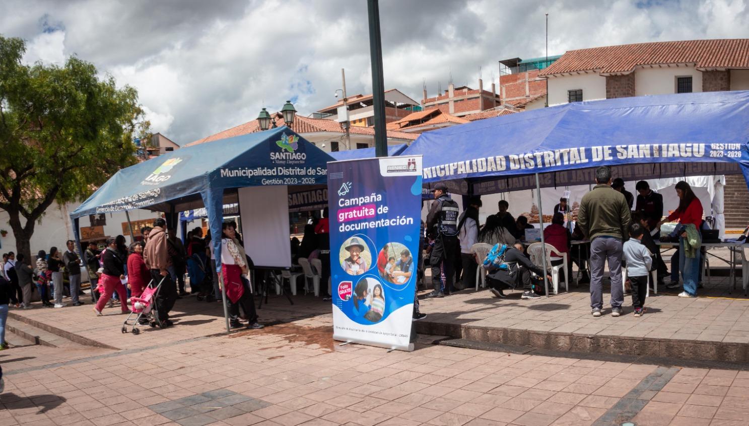 #cusco#aprimerahora.com.- La Municipalidad Distrital de Santiago, en articulación con el RENIEC, viene desarrollando una megacampaña gratuita de trámite de DNI en la Plaza Santiago, dirigida a población vulnerable y público en general.