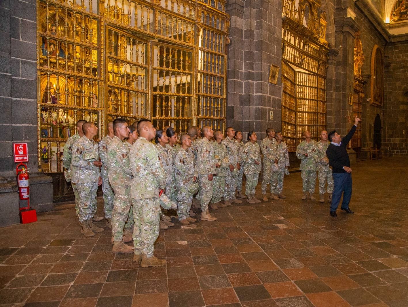 #cusco#aprimerahora.com.- En el marco de las actividades de bienestar dirigidas al personal de tropa de la Quinta Brigada de Montaña, realizo una visita guiada turística al circuito religioso del Arzobispado del Cusco, recorriendo la majestuosa Catedral del Cusco y el histórico Templo de San Cristóbal.