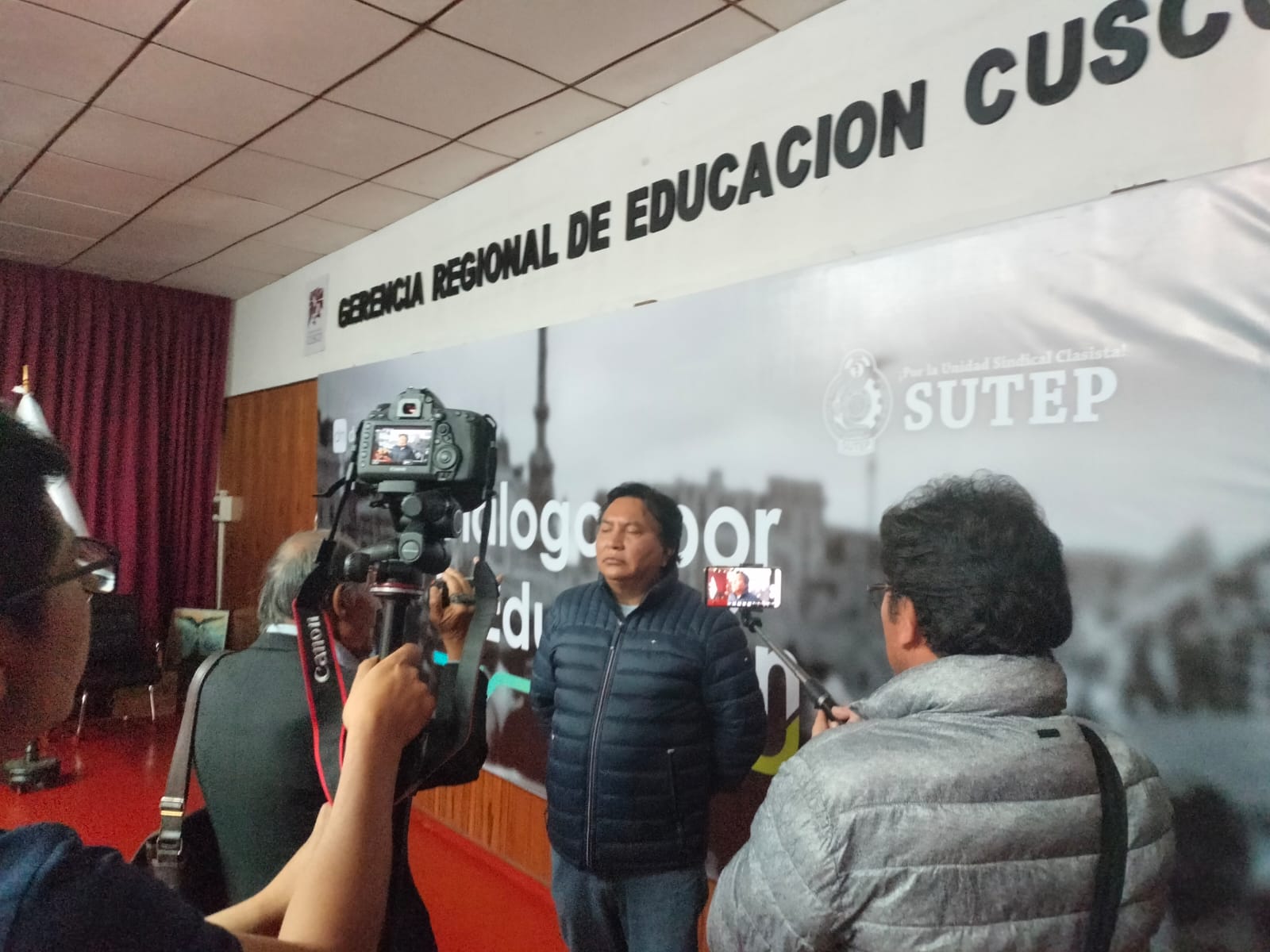 Para esta cita periodística llego el dirigente Lucio Castro, secretario general del SUTEP Patría Roja quien explico los motivos por las se declaran en huelga y esta será con una nueva modalidad de lucha., la misma que será en forma “escalonada”, que implica que diferentes regiones se irán sumando hasta la paralización total de clases si el gobierno no atiende nuestras demandas.