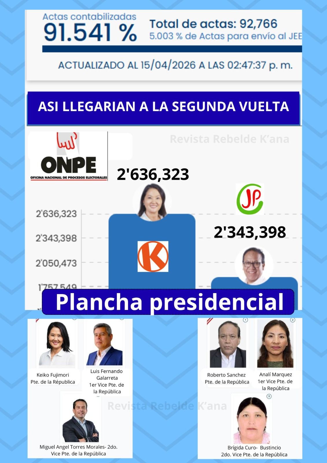 Informaron que el conteo de los votos de las elecciones presidenciales ya concluyeron aun cuando faltan por contabilizar algunas de las actas que fueron observadas se conoce que los dos partidos políticos que iran a la segunda vuelta es Fuerza Popular con Keiko Fujimori y en segunda ubicación se consolida Juntos por el Peru con Roberto Sanchez, aun cuando cuestiona estos resultados el que se halla en la tercera ubicación Rafael López Aliaga que convoca al pueblo a movilizaciones.
